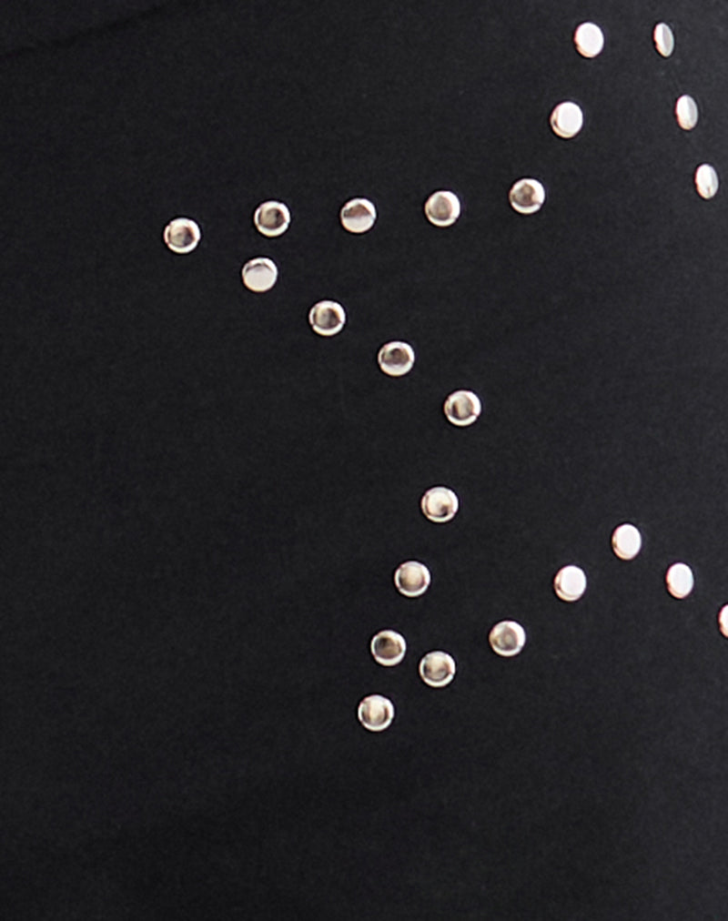 Mindi trouser in black lycra fabric. Flared leg style trouser with elasticated low-rise waistband. Finished with a star stud detail on the left hip. Complete the look with the matching Malakai top.